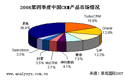 易觀國際研究表明,中國CRM產(chǎn)品市場2006年第4季度總體市場規(guī)模達到0.81億人民幣,季度增長率達到4.2%,體現(xiàn)了穩(wěn)健增長的趨勢。具體廠商方面,TurboCRM,Oracle(甲骨文),SAP位居領先地位。