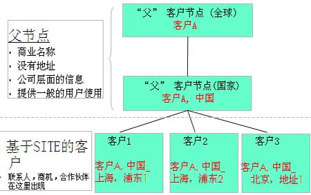 這樣對(duì)客戶(hù)的管理,尤其是對(duì)企業(yè)級(jí)客戶(hù)管理,造成了諸多不便,因?yàn)樵谂c客戶(hù)的商業(yè)行為,絕大多數(shù)時(shí)發(fā)生在SITE級(jí)別,就是與一個(gè)總公司的不同分公司的發(fā)生的交易行為。例如: