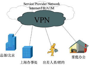 在如圖2所示的VPN 示意圖中,可以看出,VPN所賴以運行的公網(wǎng)平臺可以包括各種實際的網(wǎng)絡,例如IP網(wǎng)、幀中繼網(wǎng)、ATM網(wǎng),也可以就是因特網(wǎng)(Internet),因而也表明其網(wǎng)絡的范圍可以包括多個服務商。從地理范圍上看,VPN可以延伸到所有互相聯(lián)網(wǎng)的服務商所覆蓋的范圍。從用戶接入方式看,VPN可以包括服務商所提供的所有接入方式,如專線接入、撥號接入、無線連接等。