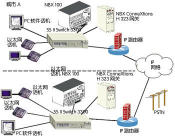 上面提到IP PBX的系統(tǒng)平臺(tái)可分為嵌入式和非嵌入式兩種。嵌入式是把整個(gè)交換系統(tǒng)、接入系統(tǒng)甚至數(shù)模轉(zhuǎn)換網(wǎng)關(guān)系統(tǒng)全部安裝到一個(gè)硬件中。如3Com公司的NBX系統(tǒng),內(nèi)置交換、模擬接入及數(shù)模轉(zhuǎn)換,通過(guò)以太網(wǎng)端口連接以太網(wǎng)交換機(jī),以太網(wǎng)交換機(jī)可以直接接入專(zhuān)用IP電話機(jī)。IP電話機(jī)一般帶2個(gè)以太網(wǎng)接口,一邊接交換機(jī),另一邊可以再連接PC,避免增加布線的需要。另外,NBX還內(nèi)置硬盤(pán),可以直接實(shí)現(xiàn)語(yǔ)音信箱、語(yǔ)音郵件等功能,還可直接加插模擬接口模塊,可以用于連接單個(gè)的普通模擬電話機(jī)或E1