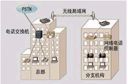 如圖2所示,兩個(gè)辦公樓之間距離較遠(yuǎn),不方便布線(xiàn),其計(jì)算機(jī)網(wǎng)絡(luò)可以通過(guò)無(wú)線(xiàn)局域網(wǎng)來(lái)連接。在總部已有電話(huà)交換機(jī)系統(tǒng),這時(shí)只需在分支機(jī)構(gòu)中增加Cisco網(wǎng)絡(luò)電話(huà)控制器,布署IP電話(huà)機(jī),然后通過(guò)總部帶語(yǔ)音模塊的Cisco路由器或交換機(jī),接入總部的電話(huà)交換機(jī),分支機(jī)構(gòu)就可以享用總部的電話(huà)中繼線(xiàn)路,與總部一樣自由地使用電話(huà)系統(tǒng)。