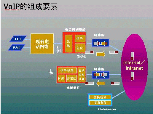 原理如下圖所示。發(fā)出信息端語音網(wǎng)關(guān)首先將語音和傳真信息數(shù)字化,然后再壓縮處理變?yōu)閴嚎s數(shù)據(jù)包在TCP/IP網(wǎng)絡(luò)中傳輸。接收端語音網(wǎng)關(guān)則將壓縮數(shù)據(jù)包先解壓,然后準(zhǔn)確地轉(zhuǎn)換成語音和傳真信息。在撥號(hào)端語音網(wǎng)關(guān)將你所撥打的電話號(hào)碼轉(zhuǎn)換成IP地址,而接收端則將IP地址轉(zhuǎn)換成電話號(hào)碼。語音網(wǎng)關(guān)與公用電話網(wǎng)(PSTN)、交換機(jī)(PBX)、集團(tuán)電話(KTS)和IP網(wǎng)絡(luò)無縫集成。