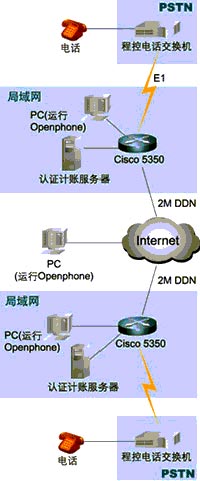 組成這個(gè)IP電話的網(wǎng)絡(luò)系統(tǒng)由處于兩個(gè)不同國家的區(qū)域組成(見附圖1網(wǎng)絡(luò)拓?fù)浣Y(jié)構(gòu)),每個(gè)區(qū)域都采用了一臺Cisco 5350路由器(以下簡稱5350)作為網(wǎng)絡(luò)的核心,這臺5350路由器具有兩個(gè)WAN口和兩個(gè)以太網(wǎng)口,能夠直接連接到本地的局域網(wǎng)和DDN基帶調(diào)制解調(diào)器。和普通電話網(wǎng)絡(luò)(PSTN)相連接則是通過添加一個(gè)E1接口卡4PRI和一個(gè)IP語音數(shù)據(jù)處理單元NP60,來實(shí)現(xiàn)E1(30條ISDN的B信道)和路由器相連接,實(shí)時(shí)地對語音數(shù)據(jù)進(jìn)行H.323壓縮編碼。