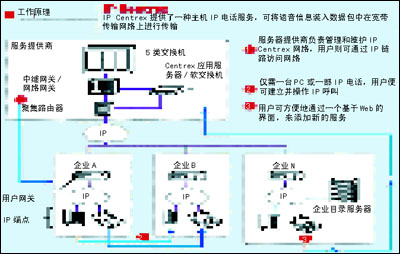 IP Centrex包含了大量能向企業(yè)提供語音業(yè)務(wù)的IP電話服務(wù),他可將呼叫裝入數(shù)據(jù)包中在寬帶傳輸網(wǎng)絡(luò)上傳送,而一個(gè)寬帶傳輸網(wǎng)絡(luò)可被用來承載多個(gè)呼叫的語音數(shù)據(jù)。在工作時(shí),如果某個(gè)呼叫還沒有激活,那么將會(huì)有更多的帶寬分配到高速數(shù)據(jù)會(huì)話中(high-speed