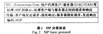 SIP不是垂直型通信系統(tǒng),不能獨(dú)立提供業(yè)務(wù),它必須與其它協(xié)議共同使用來構(gòu)建一個(gè)完整的多媒體體系結(jié)構(gòu),所以在構(gòu)建下一代網(wǎng)絡(luò)的多媒體體系時(shí),采用以下的協(xié)議組合提供多媒體業(yè)務(wù);赟IP的電話協(xié)議棧如圖1所示。圖1中,①網(wǎng)絡(luò)層:使用IPv4或IPv6(建議IPv6);②傳輸層:使用TCP或UDP(建議UDP);③應(yīng)用層:包括以SIP為核心的多個(gè)協(xié)議。