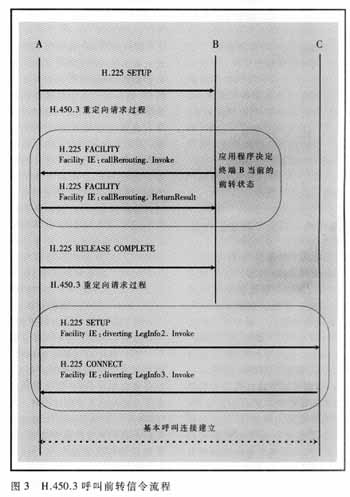 圖3顯示了可編程呼叫前轉(zhuǎn)的信令流程,在終端B的控制下通過把呼叫重新定向到一個新的目的地址而實(shí)現(xiàn)呼叫前轉(zhuǎn)。終端B在接收到SETUP消息后,發(fā)送一個包含前轉(zhuǎn)目的終端C地址的信令消息到呼叫發(fā)起終端A。然后終端A直接建立到終端C的連接,同時向終端C指明該業(yè)務(wù)的性質(zhì)和相應(yīng)信息。