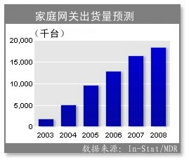 In-Stat/MDR分析師Mike Wolf說,未來5年家庭網(wǎng)關(guān)市場(chǎng)將推動(dòng)寬帶CPE市場(chǎng)增長。市場(chǎng)將從2004年出貨低于500萬臺(tái)增長到2008年超過1800萬臺(tái),年增長率30%。