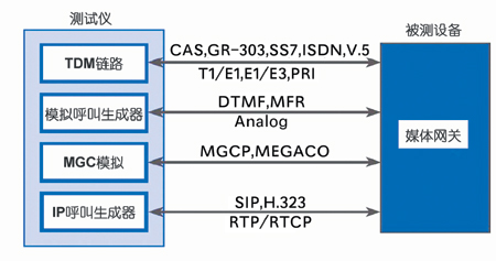 我們按照VoIP組網(wǎng)的原理,構建了這樣一個基本網(wǎng)絡,其網(wǎng)絡結構如圖4所示。我們用軟交換的概念來描述網(wǎng)絡上的設備,在這個網(wǎng)絡上,MG(媒體網(wǎng)關)和MGC(媒體網(wǎng)關控制器)是關鍵的VoIP網(wǎng)絡元素。這些網(wǎng)絡元素可以是支持H.323、MGCP、H.248或者SIP的實體。本文中提到的MG和MGC不具體指某一個設備,本次測試正是針對這兩類設備進行,測試的主要內容也圍繞著這兩類設備展開。測試從模擬話音開始,然后延伸到PSTN網(wǎng)絡,再到IP網(wǎng)絡,最后回到模擬話機的被叫方。在這樣一個完整通話過程中,測試MG以及MGC的信令互操作性以及設備處理信令的能力。圖5是測試系統(tǒng)結構原理圖。