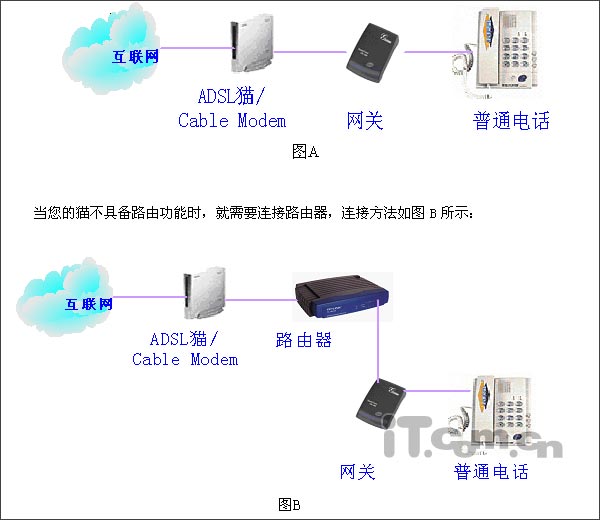 網(wǎng)關聯(lián)接至RJ45網(wǎng)線,普通電話機聯(lián)接在PHONE端口,該網(wǎng)關可通過市話線路或網(wǎng)絡撥打電話,原有市話線聯(lián)接在PSTN口上,直撥號碼時為通過網(wǎng)絡撥打,加前置碼#0*通過原有市話線撥打,如停電,所有電話均自動從原有市話線路撥出。