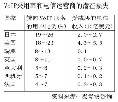 2002年春季,日本軟銀率先推出基于高速ADSL接入(Yahoo!BB)的IP電話服務(wù)BBPhone,憑借低廉的服務(wù)費(fèi)用和方便快捷的性能轟動一時。BB Phone對xDSL運(yùn)營商、ISP以及現(xiàn)有的電話運(yùn)營商帶來巨大的沖擊。Yahoo! BB的VoIP服務(wù)在不到一年時間內(nèi)就有將近300萬用戶使用,搶占了30%的寬帶市場占有率,并且吃掉了傳統(tǒng)電信運(yùn)營老大日本NTT公司3%的長途電話話務(wù)。