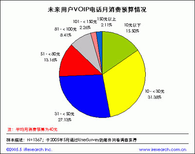 下面再讓我們看看用戶對(duì)網(wǎng)絡(luò)電話消費(fèi)預(yù)算情況,根據(jù)iResearch艾瑞市場咨詢《VOIP報(bào)告》數(shù)據(jù)顯示,月消費(fèi)預(yù)算10元以下的用戶占VOIP用戶的15%,10-30元的占31.3%,31-50元的占27.1%,51-80元的占13.2%,80元以上的占12.8%,據(jù)此計(jì)算未來用戶網(wǎng)絡(luò)電話平均月消費(fèi)預(yù)算為40元。