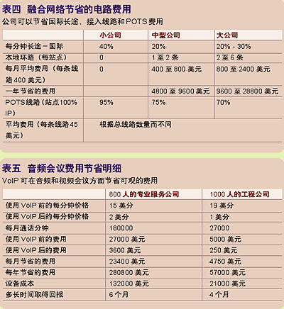據(jù)研究顯示,當(dāng)公司融合它們的網(wǎng)絡(luò)后,將電信費(fèi)用減少了25%到60%。(見(jiàn)表四)這筆費(fèi)用包括每分鐘長(zhǎng)途、本地環(huán)路、普通電話(huà)服務(wù)(POTS)線(xiàn)路和音頻/視頻服務(wù)。