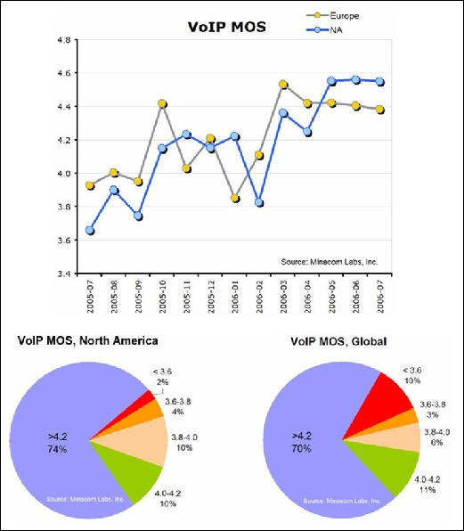 Minacom最新調(diào)研表明,一年來VoIP電話質(zhì)量和聯(lián)結速度都超過傳統(tǒng)標準公共開關電話。電話質(zhì)量得分Mean Opinion Score (MOS)數(shù)據(jù)表明,VoIP得分是4.2,而標準公共開關電話得分3.9。85%的IP電話質(zhì)量和穩(wěn)定性都超過標準公共開關電話。對電話聯(lián)結速度,VoIP的MOS得分是平均8.2秒,傳統(tǒng)電話時間更長,平均為8.9秒。這里的IP電話服務指商業(yè)企業(yè)級應用,不是MSN,雅虎通之類免費IP電話個人應用。比較而言,北美IP電話質(zhì)量優(yōu)于歐洲。