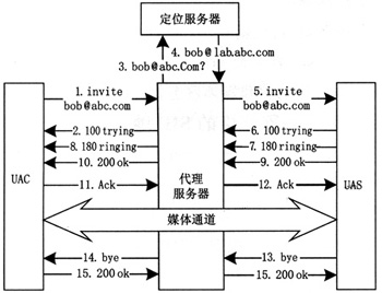 URI地址,建議利用DNS系統(tǒng),解析該地址得到該域中SIP代理服務(wù)器地址,信令到達該服務(wù)器后,再查詢該域中的位置登記服務(wù)器,即可定位到被叫用戶當(dāng)前所在地址。