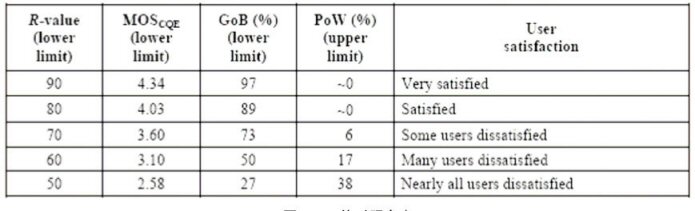G.113 Appendix I,找到合適的Ie和Bpl值);第五步:根據(jù)終端類型,確定A值;第六步:計(jì)算R值,根據(jù)R和MOS的對照關(guān)系表,得到MOS值。