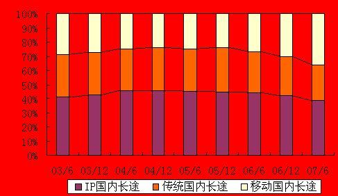 從圖中可以看出,IP電話的相對(duì)快速增長(zhǎng)在一定程度上對(duì)傳統(tǒng)長(zhǎng)途電話形成了替代作用,但近年來(lái)自于移動(dòng)長(zhǎng)途的替代作用更明顯。從占比上來(lái)看,2007年上半年,IP國(guó)內(nèi)長(zhǎng)途電話占全部國(guó)內(nèi)長(zhǎng)途通話量38.3%,超過(guò)移動(dòng)長(zhǎng)途電話的35.9%和傳統(tǒng)長(zhǎng)途電話的25.8%,仍然是長(zhǎng)途電話的主流。