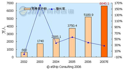從圖中可以看出,中國(guó)的寬帶用戶(hù)數(shù)保持了快速的發(fā)展勢(shì)頭,從2002-2007年年均增長(zhǎng)率為58.7%,至2007年,國(guó)內(nèi)的寬帶用戶(hù)數(shù)將達(dá)到6640.1萬(wàn)。