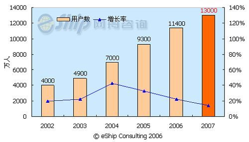 從圖中可以看出,國(guó)內(nèi)即時(shí)通訊用戶(hù)數(shù)保持了較快的發(fā)展速度,從 2002-2006年年均增長(zhǎng)率為26.6%,到2007年國(guó)內(nèi)即時(shí)通訊用戶(hù)數(shù)將達(dá)到1.3億。