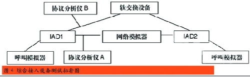 我國(guó)通信行業(yè)國(guó)家標(biāo)準(zhǔn)《基于軟交換的綜合接入設(shè)備測(cè)試方法》中明確了IAD設(shè)備九個(gè)大項(xiàng)的測(cè)試,分別是基本功能測(cè)試、協(xié)議測(cè)試、接口測(cè)試、話(huà)音業(yè)務(wù)測(cè)試、數(shù)據(jù)業(yè)務(wù)測(cè)試、性能測(cè)試、OAM測(cè)試、硬件項(xiàng)目測(cè)試和環(huán)境測(cè)試。按照?qǐng)D4所示的測(cè)試拓?fù)鋱D進(jìn)行連接,就可以按照測(cè)試方法中的測(cè)項(xiàng)要求,逐一得出測(cè)試結(jié)果。