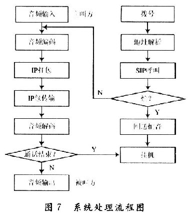 當(dāng)撥號確認(rèn)后,主控制器對編解碼器發(fā)送控制指令,開始語音A/D轉(zhuǎn)換,并進(jìn)行編碼,送到片外存儲器內(nèi)進(jìn)行緩存;Nios CPU對撥號信息的解析確定。目的地址,通過Avalon總線對以太網(wǎng)接口發(fā)送數(shù)據(jù)傳輸指令;將符合以太網(wǎng)標(biāo)準(zhǔn)的數(shù)據(jù)從片外存儲器內(nèi)讀出,送入Internet中,返回確認(rèn)信息。系統(tǒng)處理流程圖如圖7所示。