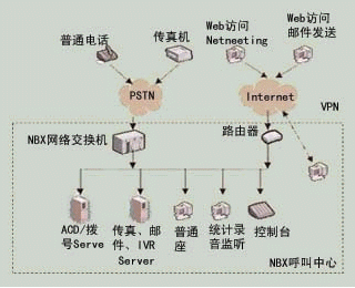 NBX呼叫中心是基于3Com公司NBX網(wǎng)絡(luò)電話交換機平臺構(gòu)筑的、語音數(shù)據(jù)合一的呼叫中心。系統(tǒng)配置拓?fù)浣Y(jié)構(gòu)如圖3所示。