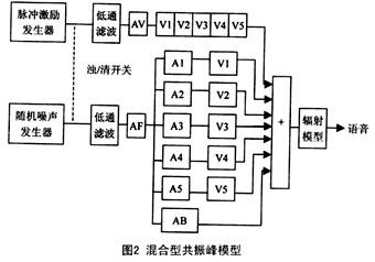 ----混 合 型 共 振 峰 模 型 在 級(jí) 聯(lián) 型 共 振 峰 合 成 模 型 中, 共 振 峰 濾 波 器 首 尾 相 接; 而 在 并 聯(lián) 型 模 型 中, 輸 入 信 號(hào) 先 分 別 通 過 幅 度 調(diào) 節(jié) 再 加 到 每 一 個(gè) 共 振 峰 濾 波 器 上, 然 后 將 各 路 的 輸 出 疊 加 起 來。 將 兩 者 比 較, 對(duì) 于 合 成 聲 源 位 于 聲 道 末 端 的 語 音( 大 多 數(shù) 的 元 音), 級(jí) 聯(lián) 型 合 乎 語 音 產(chǎn) 生 的 聲 學(xué) 理 論, 并 且 無 需 為 每 一 個(gè) 濾 波 器 分 設(shè) 幅 度 調(diào) 節(jié); 而 對(duì) 于 合 成 聲 源 位 于 聲 道 中 間 的 語 音( 大 多 數(shù) 清 擦 音 和 塞 音), 并 聯(lián) 型 則 比 較 合 適, 但 是 其 幅 度 調(diào) 節(jié) 很 復(fù) 雜。 基 于 此 種 考 慮, 人 們 將 兩 者 結(jié) 合 在 一 起, 提 出 了 混 和 型 共 振 峰 模 型, 如 圖2 所 示。