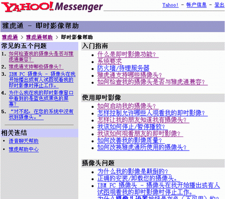 選擇工具->開啟我的攝像頭后,就會彈出“我的即時影像”窗口(圖4),如果你的攝像頭安裝連接正常,可以馬上從這個窗口中看到你的影像;如果你的攝像頭正常,但在窗口中卻沒有看到影像,你可以在聯(lián)網(wǎng)的情況下選擇當(dāng)前窗口中的幫助->即時影像幫助進(jìn)入相關(guān)網(wǎng)頁(圖5)對你的攝像頭進(jìn)行雅虎通的兼容性測試,或者尋求更為詳細(xì)的幫助。