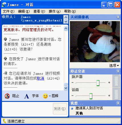 單擊對話框右邊的“啟動攝像機(jī)”和“開始交談”,系統(tǒng)會提示你正在等待對方回應(yīng)視頻或語音對話的邀請,對方接受,就開始進(jìn)行視頻通話(見圖11)。如果雙方都有攝像頭,你還可以通過視頻框下面的“選項(xiàng)”將自己的影像設(shè)為畫中畫的功能。