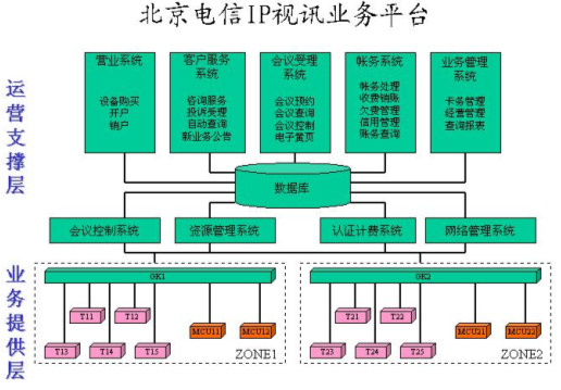 在整個運營支撐層的系統(tǒng)中,主要包括四大系統(tǒng),即會議控制系統(tǒng)、資源管理系統(tǒng)、認證計費系統(tǒng)、網(wǎng)絡(luò)管理系統(tǒng)。除此之外,還有其它幾個輔助系統(tǒng),包括營業(yè)系統(tǒng)負責(zé)為客戶開戶和銷戶,終端注冊等處理;客戶服務(wù)系統(tǒng)提供咨詢服務(wù)、投訴受理、自動查詢和幫助客戶進行會議預(yù)約,在資源不足的情況下進行會議調(diào)度等;會議受理系統(tǒng)是面向客戶提供會議電視業(yè)務(wù)預(yù)約、會議狀態(tài)查詢、會議控制服務(wù),由用戶自助完成預(yù)約會議和控制會議的操作;賬務(wù)系統(tǒng)負責(zé)賬務(wù)方面的管理,包括賬務(wù)管理,收費銷賬,催繳欠費、銀行繳費等;業(yè)務(wù)管理系統(tǒng)主要是記賬卡的卡務(wù)處理、經(jīng)營管理、查詢報表等。