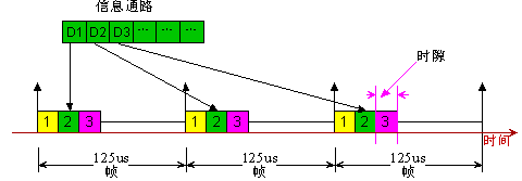 TDM就是時(shí)分復(fù)用模式。它把若干不同通道(Channel)的數(shù)據(jù)按照固定位置分配時(shí)隙(TimeSlot:8Bit數(shù)據(jù))合在一定速率的通路(Path)上。每一個(gè)時(shí)隙的速率為一個(gè)標(biāo)準(zhǔn)的PCM(Pulse-Code-Modulation)話路64Kbps。每通道時(shí)隙的重復(fù)頻率為T(mén)s=8KHz,即幀周期為125us。如圖2所示。通常把若干通話復(fù)用在一起以后的通路組稱為一個(gè)基本群路,然后更大的通路均在此基礎(chǔ)上進(jìn)一步復(fù)用(4倍)為高次群。其中的時(shí)隙數(shù)即復(fù)用的通道數(shù)與時(shí)鐘有關(guān)。國(guó)際上有兩個(gè)不同的基群標(biāo)準(zhǔn)(PRI:Primary Rate Interface)。美國(guó)和日本采用24支路標(biāo)準(zhǔn),我國(guó)采用歐洲標(biāo)準(zhǔn),使用32路標(biāo)準(zhǔn),分別記為: