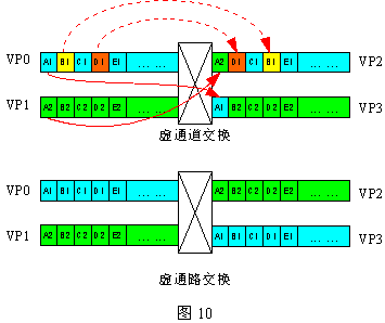 ATM中的兩種交換:虛通道交換(VCS:Virtual Channel Switching)和虛通路交換(VPS:Virtual Path Switching)。前者指同一個VP內(nèi)或不同VP內(nèi)的VC之間的交換;后者指一個VP內(nèi)所有信元同時被映射到另一個VP內(nèi)的過程。見下圖10。