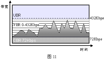 - 可變比特速率(VBR:Variable Bit Rate):允許隨時可變的帶寬,但必須指定峰值帶寬、最大突發(fā)數(shù)據(jù)長度和必須維持的最低速率。