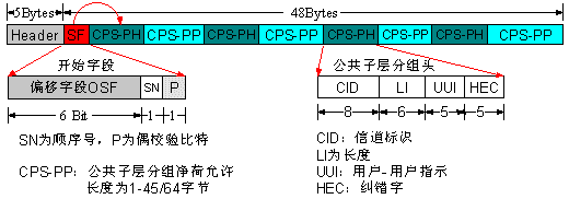 圖中清楚地顯示了一個ATM信元中傳輸多路話音的情形。其中的各CPS-PH+CPS-PP相當于該ATM信元所在VC中的微通道(Mini-Channel),這就允許選擇最佳的分組尺寸以獲得最小時延,同時允許多個活動AAL2微通道有效地復用在一個VC中,從而提高帶寬效率。