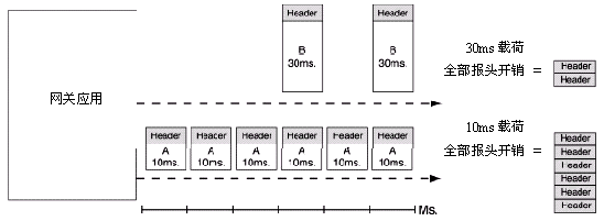 在一個減少發(fā)話方和受話方間音頻反應時間的努力中,VoIP網(wǎng)關通常會配置成發(fā)送較小的語音數(shù)據(jù)載荷。雖然這樣做通常可以減少聽得見的傳輸延遲,但同時也增加了一個給定語音數(shù)據(jù)流需要傳遞的包的數(shù)量。因為不管多小的音頻載荷都需要一個固定大小的包報頭,網(wǎng)上需要傳遞的數(shù)據(jù)量越大這個效果越明顯──跟隨的是網(wǎng)絡包和數(shù)據(jù)流量的相應增長。圖1說明了用于傳輸包報頭的帶寬會隨著包載荷大小的縮小而增大。