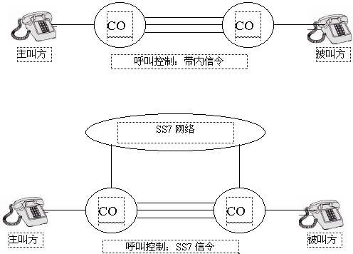 在任一個電話系統(tǒng)中,都要規(guī)定一些固定的信令機制來實現(xiàn)呼叫的建立和釋放。最初,象POTS(普通舊電話業(yè)務)那樣的電話系統(tǒng)都是用帶內(nèi)信令來傳遞信息。帶內(nèi)信令是指信號的頻率在話音頻率范圍之內(nèi)(0.3~3.4kHz),比如:DTMF信號就屬于帶內(nèi)信號。帶內(nèi)信號是在話音通道內(nèi)傳遞的。相反,SS7使用一個完全獨立于話音網(wǎng)的數(shù)據(jù)網(wǎng)來傳遞信令,這樣可以大大提高電話網(wǎng)絡的利用率。比如,在呼叫發(fā)起但未建立完成之前,不需要分配話音電路,這使得傳遞的信令數(shù)據(jù)只和呼叫有關而和電路無關,為在交換機之間、交換機和其它網(wǎng)絡之間高效、可靠地傳遞信息提供了可能。同時也支持更高級的應用,如:主叫識別、無線漫游和800號業(yè)務。如下圖1,顯示出了帶內(nèi)信令和SS7在呼叫接續(xù)上的區(qū)別。
