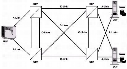 SS7提供消息傳遞以實現(xiàn)正確無誤的業(yè)務功能,如呼叫建立。因此,SS7被設計成能達到相當高的可靠性?煽啃詠碜枣溌返亩鄻有院腿哂鄠浞。圖4說明了一個簡單SS7網(wǎng)絡的標準例子,著重說明了一些內(nèi)建的可靠性特征,比如鏈路的網(wǎng)狀配置,這樣使得網(wǎng)絡中的每個信令點間都有冗余備份的鏈路,從而提高了整個網(wǎng)絡的可靠性。
