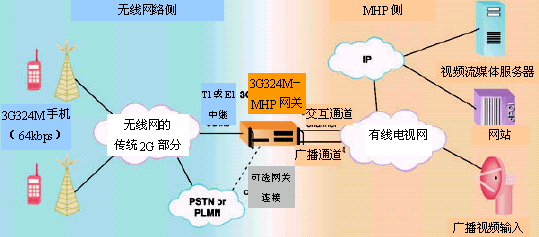 兩個網(wǎng)絡(luò)一旦連通,視頻流就會在兩個方向流動。從網(wǎng)關(guān)流向用戶的視頻流包含有MHP準(zhǔn)備好的內(nèi)容,但從用戶流向網(wǎng)關(guān)的任何視頻流都會被丟棄。AMR音頻也會在兩個方向流動