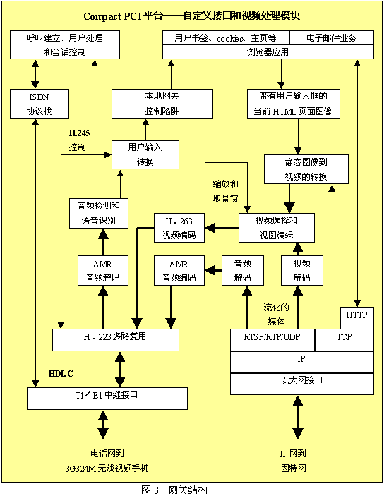圖3所示為網(wǎng)關(guān)重要組成的分解圖。網(wǎng)關(guān)機箱很可能是一個Compact PCI機箱,機箱中包含了作為網(wǎng)絡(luò)中一個節(jié)點的所有組件;镜囊曨l呼叫和瀏覽器應(yīng)用可以運行在主處理器上,但T1或E1接口需要由附加模塊來支持。為了支持大量的端口,還需要附加的以太網(wǎng)接口和自定義的視頻處理模塊。T1/E1接口通過公共電話網(wǎng)接入無線交換中心,也可以直接接入到無線交換中心。以太網(wǎng)接口會通過標(biāo)準(zhǔn)IP路由器接入到因特網(wǎng)。