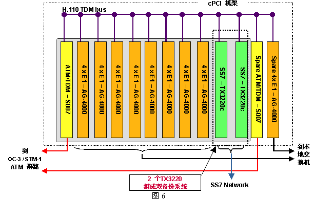 為具體起見,圖6給出一個(gè)960話音端口的應(yīng)用方案,其中用到了三種NMS公司的設(shè)備:AG-4000c、S007和TX-3220c,圖中未列出用來運(yùn)行應(yīng)用程序的CPU板(AG4000系列板卡不含CPU,而AG600eC包含了CPU)。