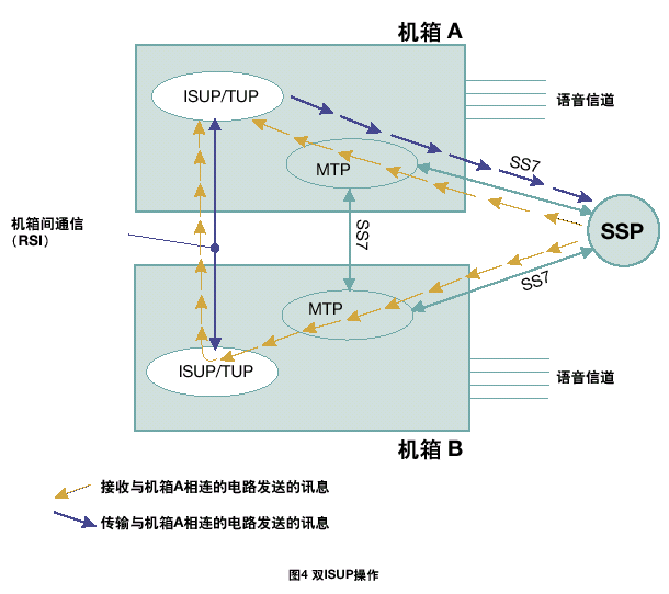 一個(gè)雙ISUP/TUP系統(tǒng)通過激活每個(gè)機(jī)箱中的一半電路協(xié)議狀態(tài)機(jī)進(jìn)行工作。每個(gè)ISUP/TUP層通過本地MTP3發(fā)送所有的傳送流量。本地MTP3采用與相鄰SS7節(jié)點(diǎn)之間的本地鏈路進(jìn)行傳輸,如果該鏈路發(fā)生故障,則采用機(jī)箱之間的SS7鏈路。