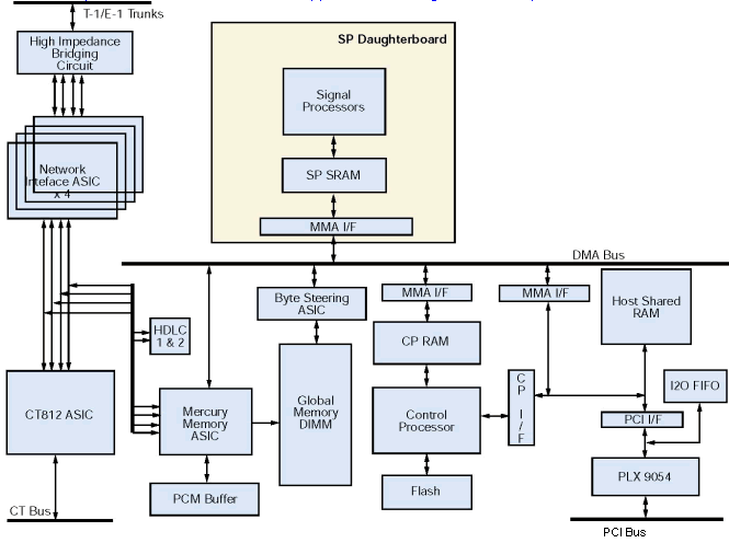 (T-1和E-1裝配有所不同) 兩塊子板上面各有一組DSP. 當(dāng)開電時(shí)電話信令協(xié)議和語音處理功能被下載到板卡上. 在處理器上作為固件存在,
