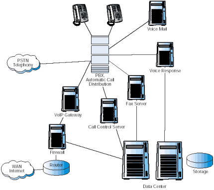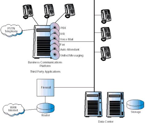 圖1描述了當前一個典型的復雜的企業(yè)通信系統(tǒng)配置。連接到PSTN的主要部分PBX/KTS,仍然是系統(tǒng)的核心,提供了交換和自動呼叫分配的功能。一系列增加的應用通過附屬服務器連接到PBX/KTS上。很多附屬服務器也連到數(shù)據(jù)中心上,因為它們需要訪問企業(yè)的數(shù)據(jù)。 使現(xiàn)有情況變得更為復雜的是,Internet正在變?yōu)椴豢扇鄙俚纳虅展ぞ,各公司紛紛安裝VoIP以降低網(wǎng)絡成本,滿足多媒體通信的需要。這些服務由企業(yè)防火墻后的網(wǎng)關提供,這個網(wǎng)關也是連接到PBX/KTS上的。