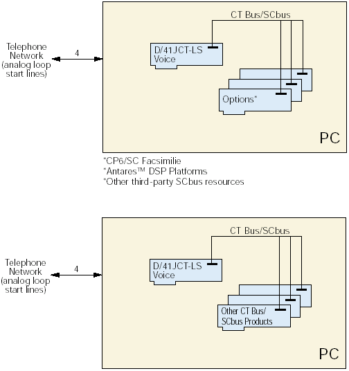 使用D/41JCT-LS板卡和CT總線時,來自網(wǎng)絡(luò)板卡或其他資源的數(shù)字語音和資源通過H.100接頭和CT總線接口進入板卡。由一個CT612芯片管理這些信號,并且作為通道協(xié)調(diào)器和矩陣交換機來緩存來自總線的高速信號數(shù)據(jù),直到每個通道的數(shù)據(jù)發(fā)送到DSP。